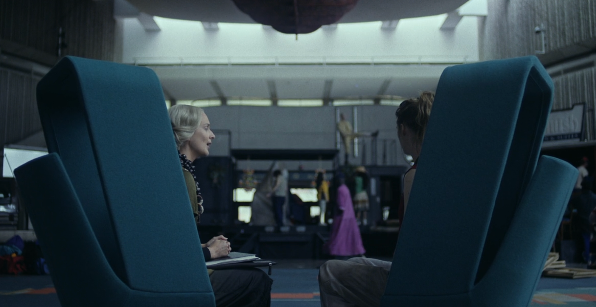 The walled-in quality also provides relief from a darker reality, promising privacy, or at least the illusion of it, in a world where we’re increasingly surveilled. It’s the tension between exposure and concealment, a hallmark of science fiction to which the chair serves as a microcosm and becomes a major component in world-building. There's a single shot in Station Eleven that never fails to awe me: a conversation between MacKenzie Davis and Caitlin Fitzgerald in the Severn Airport, a post-pandemic fortress played by the brutalist Ontario Science Center. We watch from behind as Davis and Fitzgerald huddle in a pair of space-age loungers much like Poole and Bowman in the pod, but unlike the ill-fated astronauts, their wraparound enclosures offer a feeling of comfort and intimacy.