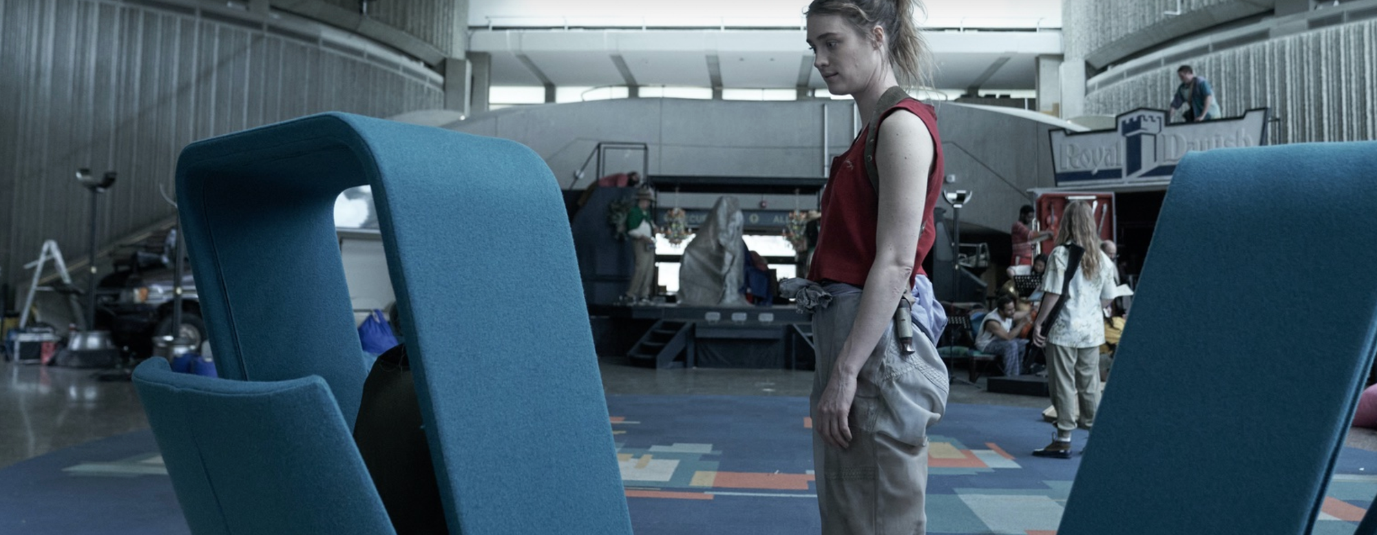 In this alternate future, the chairs are layered with meaning: artifacts of a pre-pandemic era, but before that, relics of an earlier time whose aesthetic tried to will itself into the future. Davis in her rough utilitarian clothing, her hair pulled into a messy bun, and Fitzgerald’s braids and a period costume (she is to play the role of Gertrude in a post-apocalyptic Hamlet) add to this sense of temporal overlap, like the flood-damaged fresco described in Ali Smith’s How To Be Both, whose restorers “found, underneath them, the underdrawing their artists had made for them, and sometimes the underdrawings were significantly different from their surfaces, which is something they’d never have discovered if there hadn’t been the damage in the first place.”