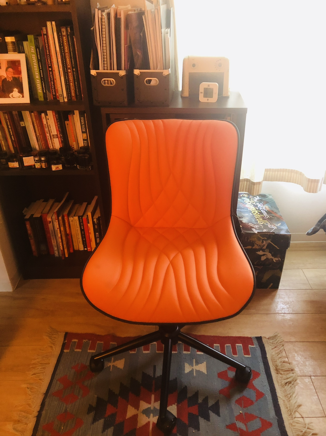 This new chair is sturdy and mobile, with a look that evokes Logan’s Run— if Logan worked at a Staples— and its color is the same burnt tangerine of the Glasgow Subway, one of the finest retro-future experiences for your money. Now when I sit at my desk, I don’t feel like I’m merely writing, but maybe helming the Enterprise or interfacing with the City Computer while it hoovers years from my life and insists that there is no sanctuary.